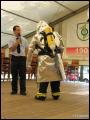 | Am Nachmittag fand eine Feuerwehr-Modenschau im Festzelt statt, bei der die Gäste einige Einsatzgarnituren bestaunen konnten. Neben den gewohnten Uniformen und der Brandschutzkleidung wurden ein Waldarbeiter-Anzug, ein Imkerschutz, ein Überlebensanzug für Gewässer, die Höhenretter-Uniform, sowie schwere Chemieschutzanzüge und Hitzeschutzanzüge vorgeführt. Marcel Walter, der die Modenschau moderierte, ging hier auf spezielle Details eines jeden Anzugs ein. So hat zum Beispiel der Waldarbeiter eine ganz spezielle Schutzkleidung, die innen aus einer Vielzahl langer Fasern besteht. Durchtrennt die Kette der Motorsäge die oberste Stoffschicht der Schutzhose, werden ganze Faserbündel herausgerissen. Die losen Fasern blockieren das Kettenrad völlig und bringen die Sägekette somit zum Stillstand. Dadurch wird das Risiko einer Verletzung erheblich vermindert.
