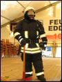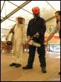 Weiterhin wurden Hitzeschutzanzüge in drei verschiedenen Ausführungen - von leichtem Schutz über mittleren bis hin zu schwerem Hitzeschutz - gezeigt. Während man einen Wohnungsbrand (600 bis 800°C) noch unter normaler Brandschutzkleidung löschen kann, verursachen bestimmte Feuer, wie zum Beispiel ein brennender Benzin-Tanklaster, erheblich höhere Temperaturen. Damit sich Feuerwehrleute dennoch dem Brand soweit nähern können, dass eine Brandbekämpfung möglich ist, gibt es Hitzeschutzanzüge. Diese bestehen aus einem speziellen Material, das die Wärmeentwicklung zumindest teilweise abweisen kann. Einige dieser Garnituren kommen aufgrund ihrer Spezialisierung so selten zum Einsatz, dass es sogar für Feuerwehrleute selbst eine höchst interessante Vorführung war.